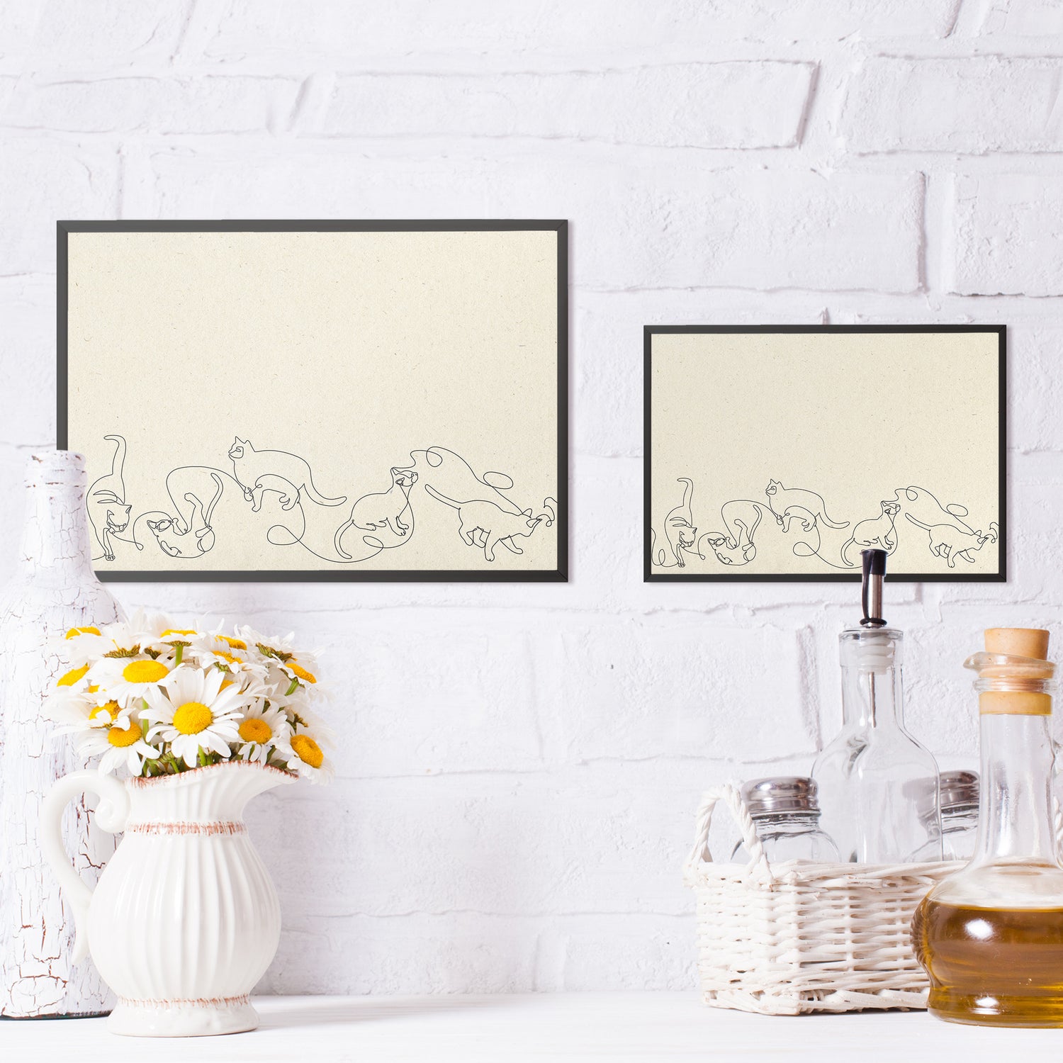 たくさんの猫たちが生き生きとした仕草で描かれたアートです。遊び心がありながらも、シンプルでモダンな雰囲気も持ち合わせています。