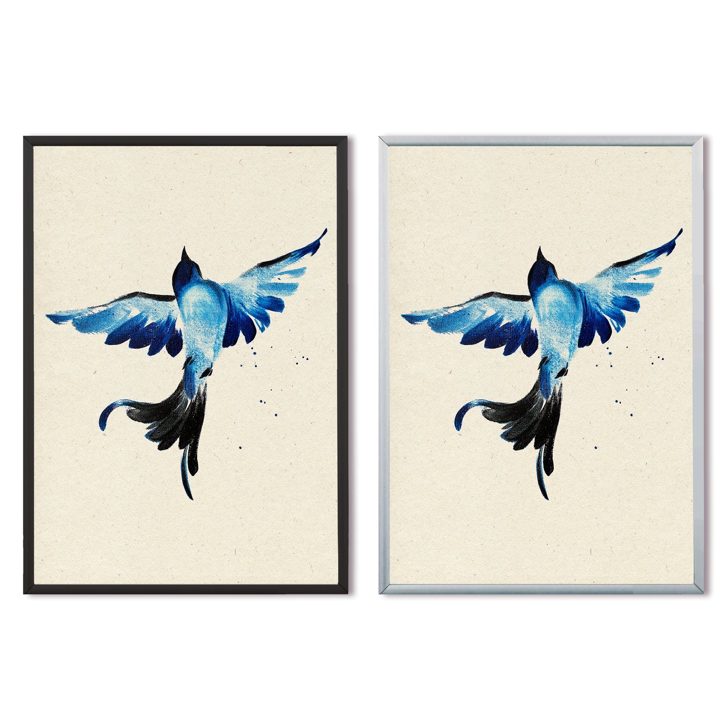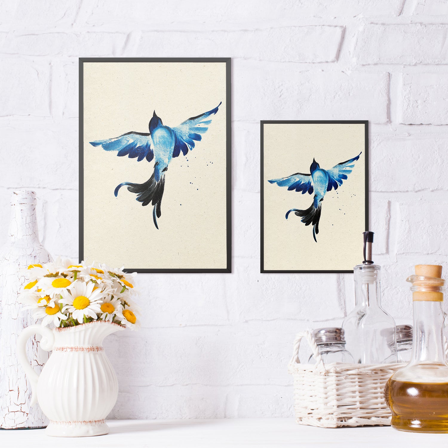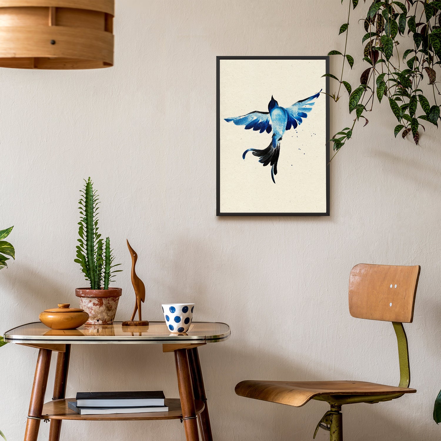 青い鮮やかな飛鳥が描かれた水彩手書き風ポスター。